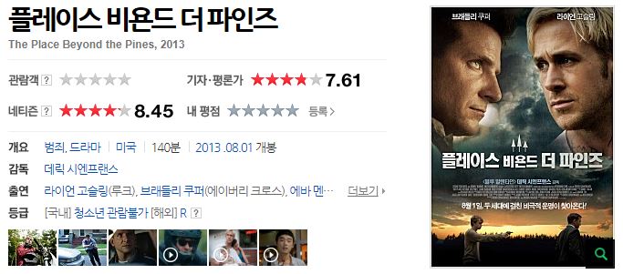 이번에 리뷰 할 영화는 2012년 개봉 한 플레이스 비욘드 더 파인즈 (Place beyond the pines) 이다. 영화에 나오는 배우들이 다 유명한 배우들 이고, 범죄, 드라마 장르라 무언가 스펙터클한 액션영화를 기대 했지만 생각보다 잔잔한 진행에, 여운이 많이 남는 영화였다.